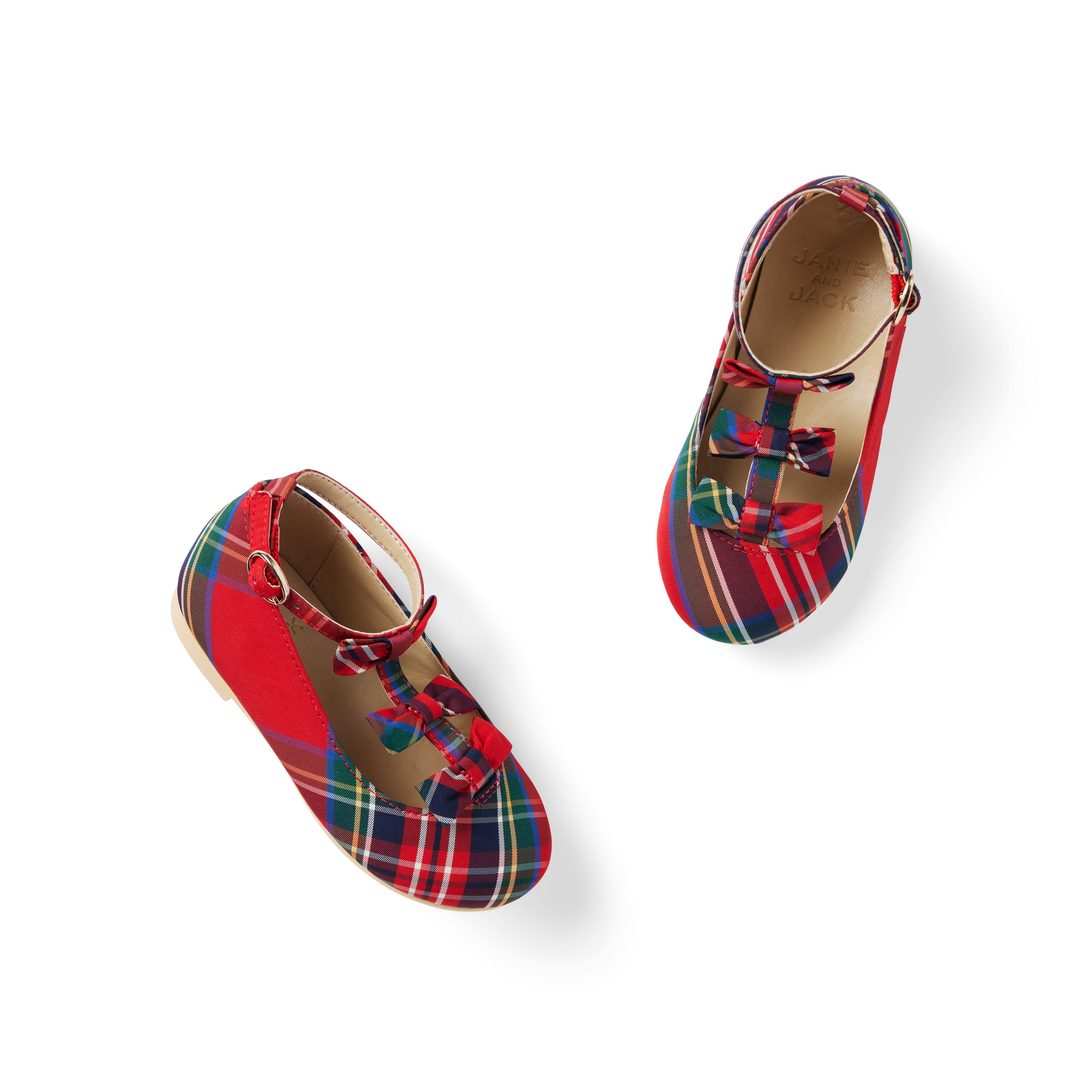 Our kind of fancy footwork, these holiday-ready tartan T-strap flats finished with a row of bows are perfect for their next occasion. Textile; Manmade Material Sole Matching Family Styles Available Buckle Closure Spot Clean; Imported