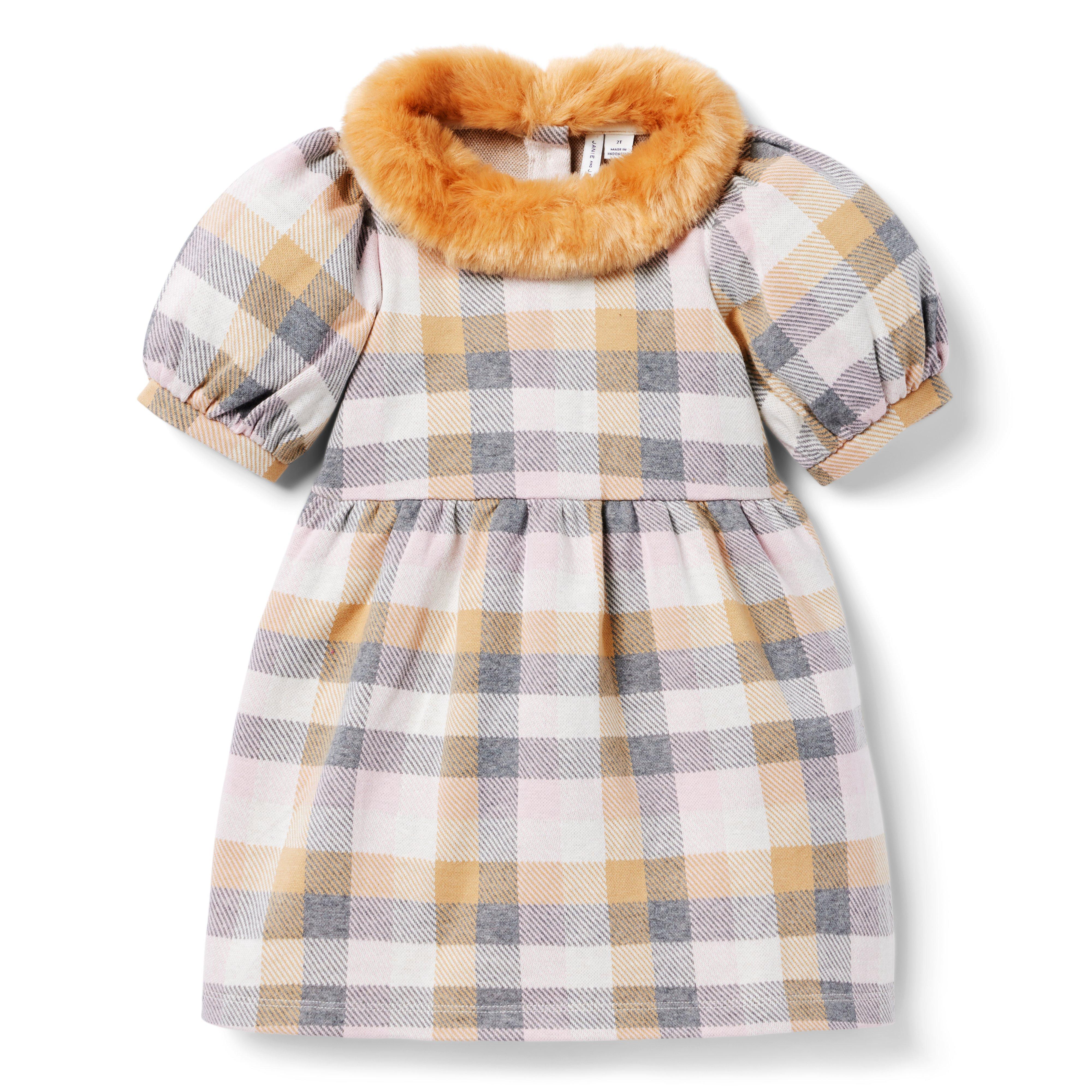 Plush faux fur and allover tartan? It's a dress made for their next cozy occasion. In soft double knit jacquard with puff sleeves for a little something extra. 100% Cotton Jacquard; Collar: 75% Acrylic/25% Polyester Faux Fur Short Sleeve Button Back Above The Knee Length Bloomer Included (Sizes Up To 18-24M) Machine Washable; Imported
