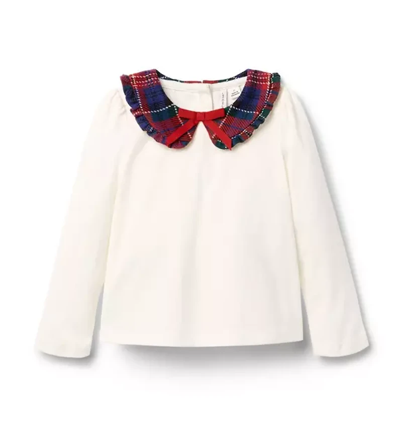 Holiday style starts at the collar with this soft cotton jersey top. Featuring festive tartan, ruffle trim and a bow, of course. 100% Cotton Jersey Long Sleeve Button Back Machine Washable; Imported