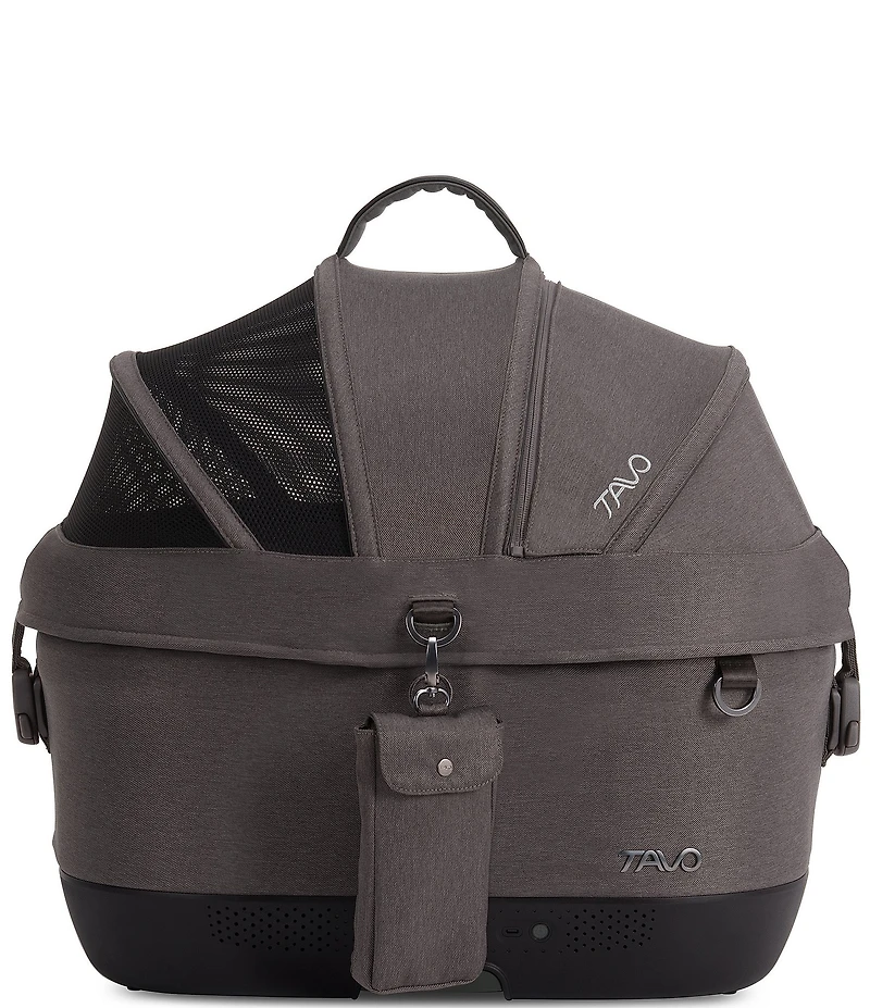 From Tavo Pet, this pet car seat features: Your pet’s ultimate comfort zone: Designed to reduce anxiety and provide your pet with a home away from home while traveling. Spacious pod and structural canopy create a cozy area that your dog or cat will look forward to curling up in. One-touch integrated fan system with two speed settings (low/high) keeps air moving when temperatures rise. Fan system is USB-powered for connectivity on the go (power bank not included). Flexible mesh ventilation panels on canopy allow for airflow and a view to the world for your pet. Peek-a-boo window for checking in and seeing out. Canopy opens on either side and is easily removed for the ultimate customized space. Curated premium materials: Our fabrics are naturally flame-resistant, free of harmful fire-retardant chemicals, making them safer for your pet. Canopy fabric is UPF 50+, the maximum sun protective rating achievable for fabrics. Includes two liner and mattress cover sets that easily zip on and off and are machine washable. One standard set–A durable fabric that matches the exterior color of your carrier. One mesh set–A breathable mesh fabric designed to enhance ventilation and promote airflow to keep your pet cool and comfortable. Includes two padded mattresses, which are easy to rinse and wipe clean. Premium vegan leather accents for a luxe touch. Integrated ISOFIX latches: Securely fastens to the vehicle seat, preventing the car seat and pet from becoming airborne and potentially harming other vehicle occupants during sudden stops or accidents. Integrated ISOFIX latches pop out and connect to the vehicle's rigid latch anchor bars, ensuring a secure and simple installation in seconds. Colored indicators on the car seat confirm a secure ISOFIX connection. Latches conveniently stow away when not in use. Baseless connection allows easy transition between vehicles. Engineered for safety: Crash-tested at Tavo's dynamic testing facilities that feature cutting-edge equipment and technology benchmarked against the latest United Nations ECE child restraint standard (R129). Lightweight yet durable EPP foam surrounds your pet, absorbs energy, and disperses impact. Includes a unique guard featuring Tailor tech™ memory foam that absorbs energy and offers enhanced Side Impact Protection (SIP) secures easily onto the carrier frame. MagneTech secure snap™ buckles quickly secure the canopy and provide frustration-free access. Designed details: Open canopy extends beyond 90° for an easier reach and a better view. Includes a power bank bag that clips onto the carrier for easy access and convenient cooling on the go. Top-carry handle wrapped in luxe vegan leather. Rubberized feet minimize movement as your pet jumps in and out at home. 2 leashes of different lengths to keep your pet connected when strolling with an open canopy. High-strength alloy leash attachments available on both sides of the carrier interior. Easy-to-access button for a struggle-free, one-handed release from the vehicle to simplify transfers from home to car and back. Imported.