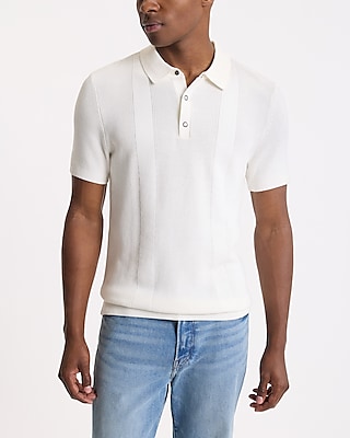 A timeless short sleeve sweater polo that features a textured stripe pattern, a point collar, and a snap button placket.