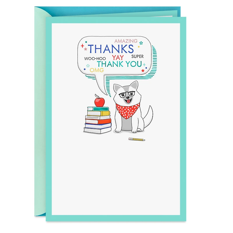 Thank you greeting card features a drawing of a cute dog wearing glasses and a red bandana standing next to a stack of books topped with a shiny red apple. The sweet message of gratitude is perfect for sharing with a special teacher, principal, paraprofessional, bus driver, counselor, librarian or other valued school support staff member. Foil and embossed accents add a fun touch.