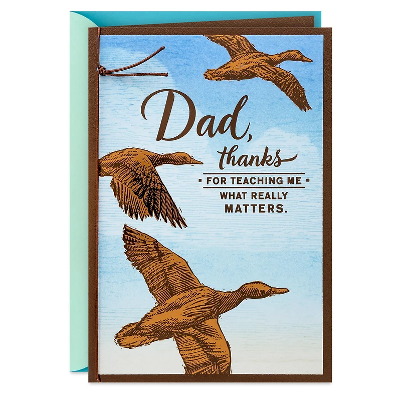 Father's Day greeting card for your dad features an illustrated design of a trio of ducks flying in a bright blue sky paired with a heartfelt message of love and gratitude for all he's taught you through the years. Foil accents and bronze elastic cord trim add handsome finishing touches.