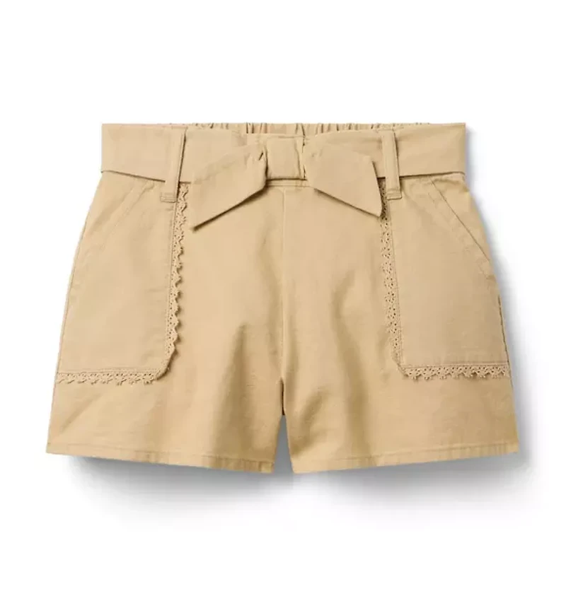 Our classic canvas short gets a fashionable twist with lace trim and a bow detail. With pockets for the little things, of course. 100% Cotton Canvas; Lining: 100% Cotton Elasticized Back Waist Front And Back Pockets Fully Lined Machine Washable; Imported