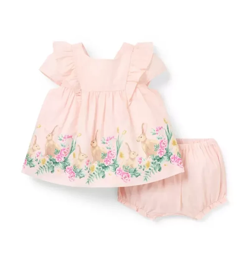 A bunny border print makes this set the perfect match for first Easter moments. Designed in pure cotton with ruffle details and a bow at the back. 100% Cotton Batiste; Lining: 100% Cotton Fully Lined Short Sleeve Button Back; Elasticized Waist Makes The Perfect Gift For Baby Machine Washable; Imported