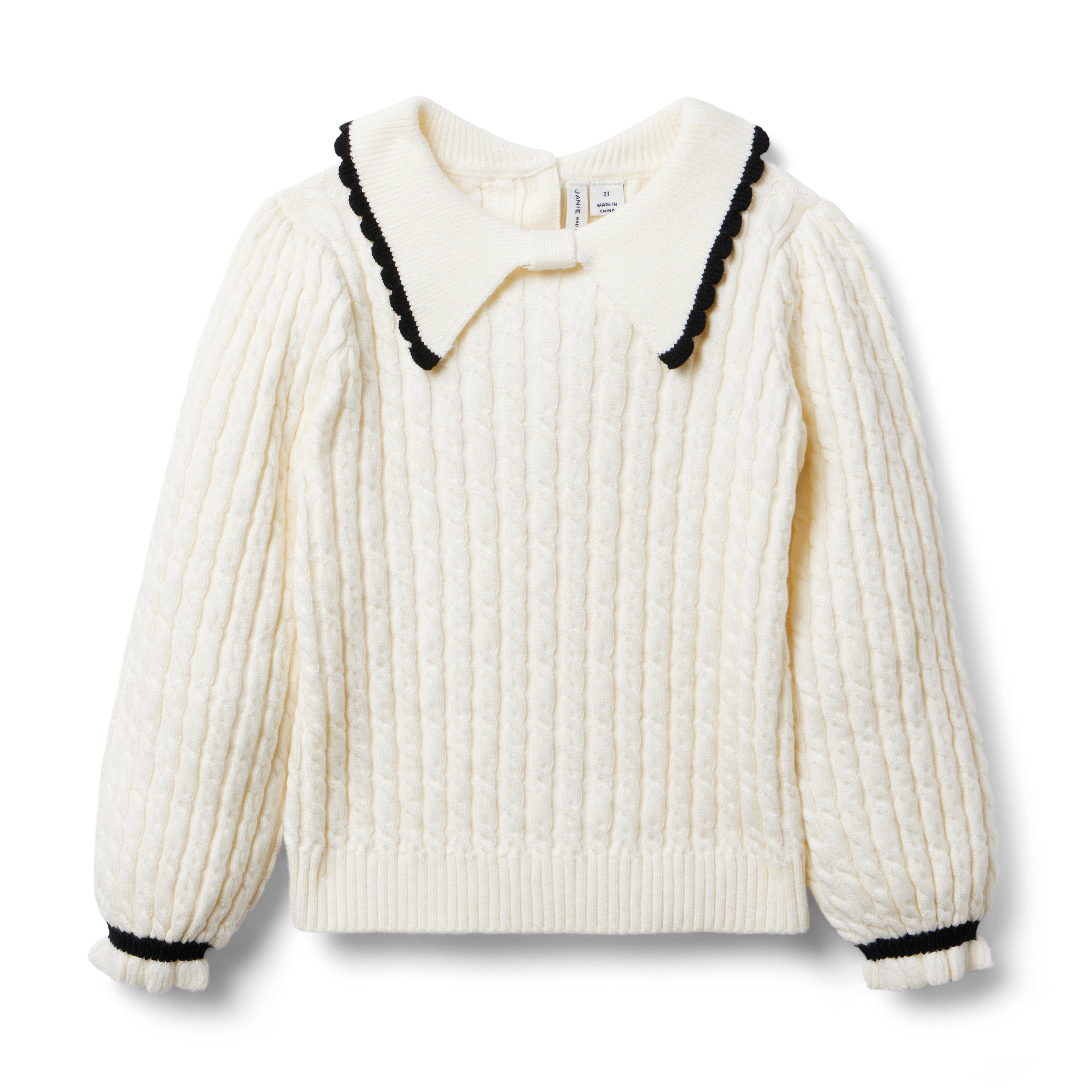 Our close-knit favorite with preppy style, this soft sweater with a scalloped bow collar, cable details and little ruffle cuffs. 55% Cotton/25% Rayon/20% Nylon Long Sleeve Button Back Machine Wash, Inside Out, Gentle Cycle; Imported