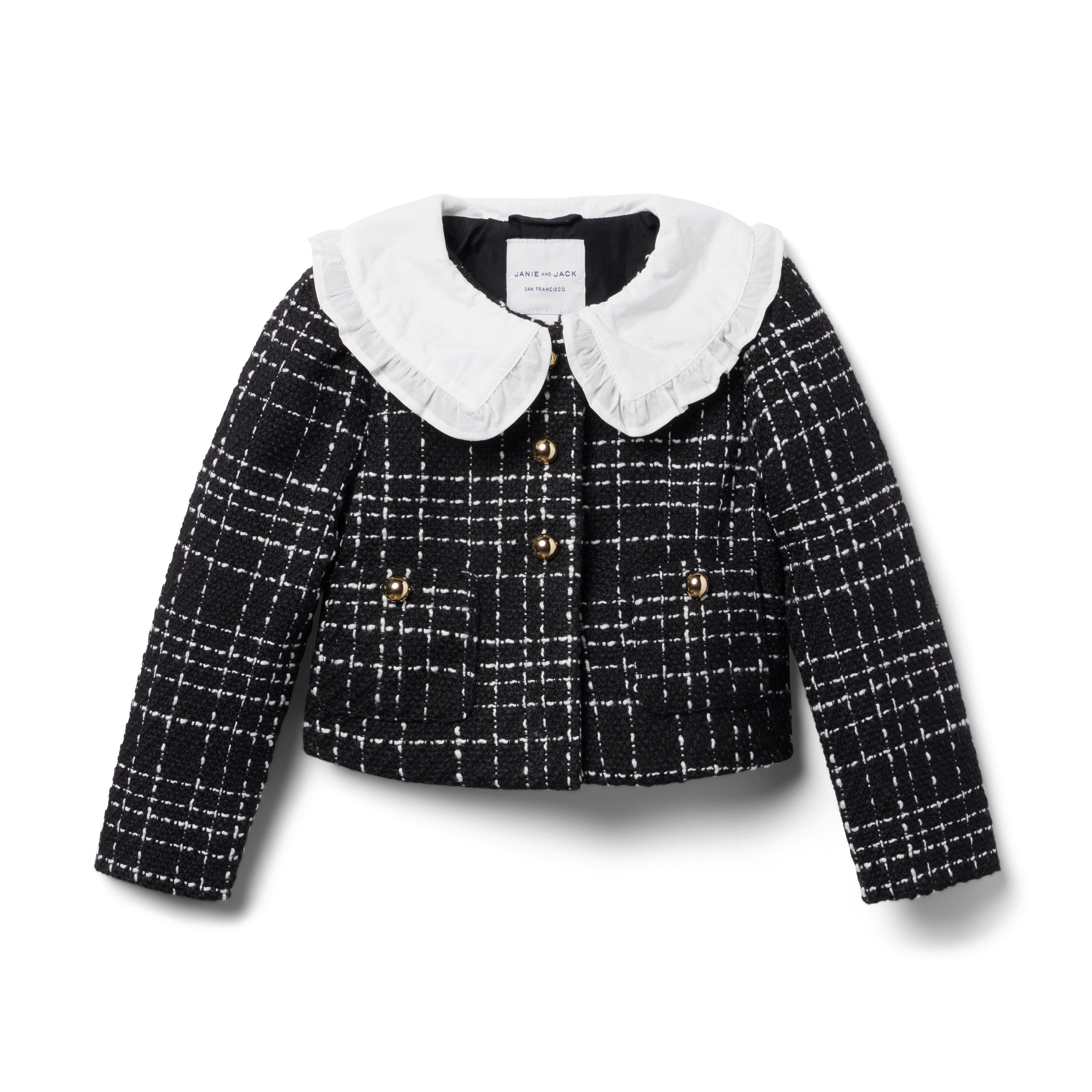 Add instant polish to any look with our classic boucle tweed jacket. Featuring a ruffle-trimmed collar, just for the frill of it. Plus, gold-tone buttons and a cropped length we love. 100% Polyester Tweed Fully Lined Long Sleeve Button Front Front Pockets Cropped Length Machine Wash, Inside Out, Gentle Cycle; Imported