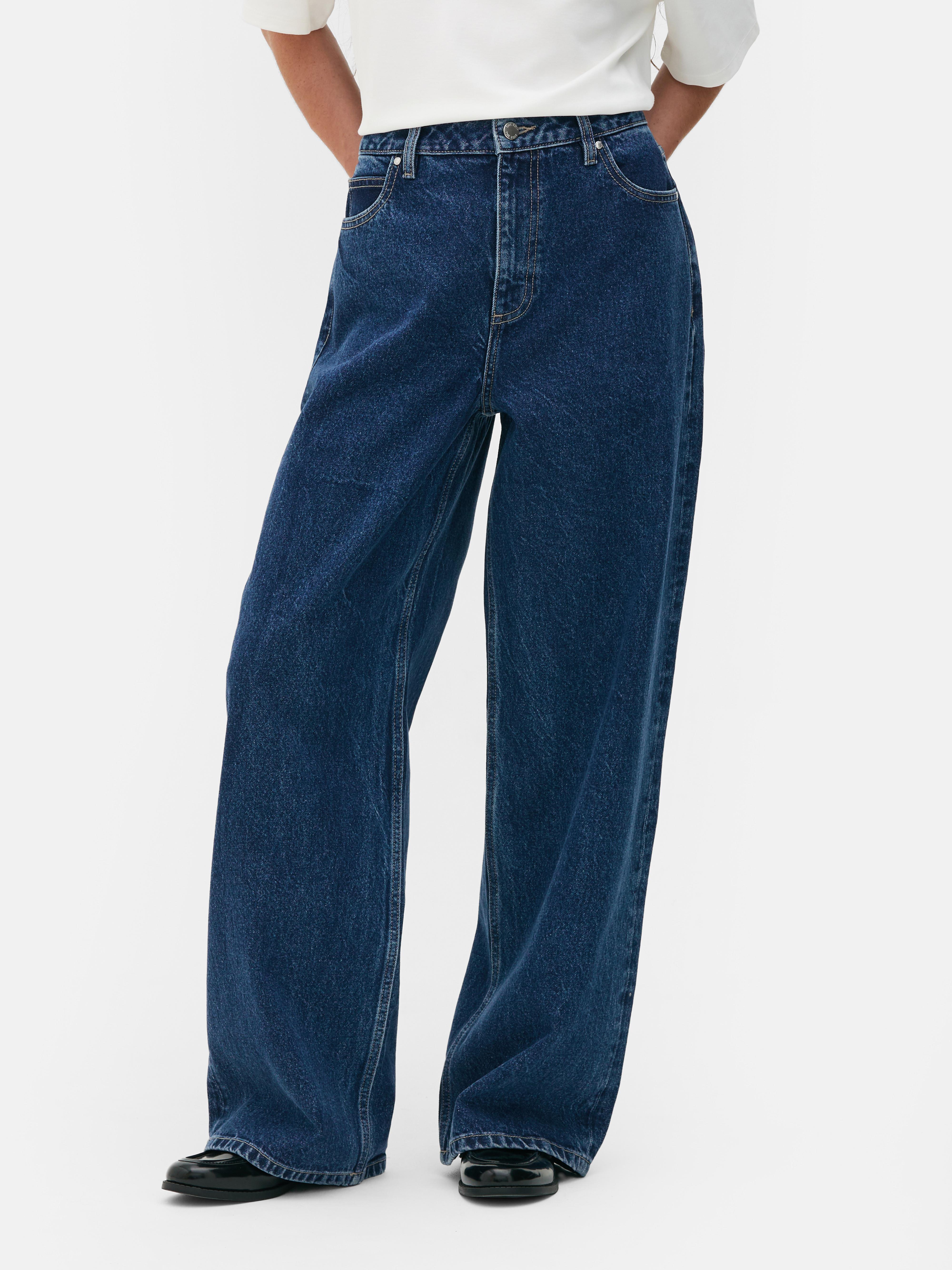 Dark wash wide leg jeans with a high waist and classic five-pocket design