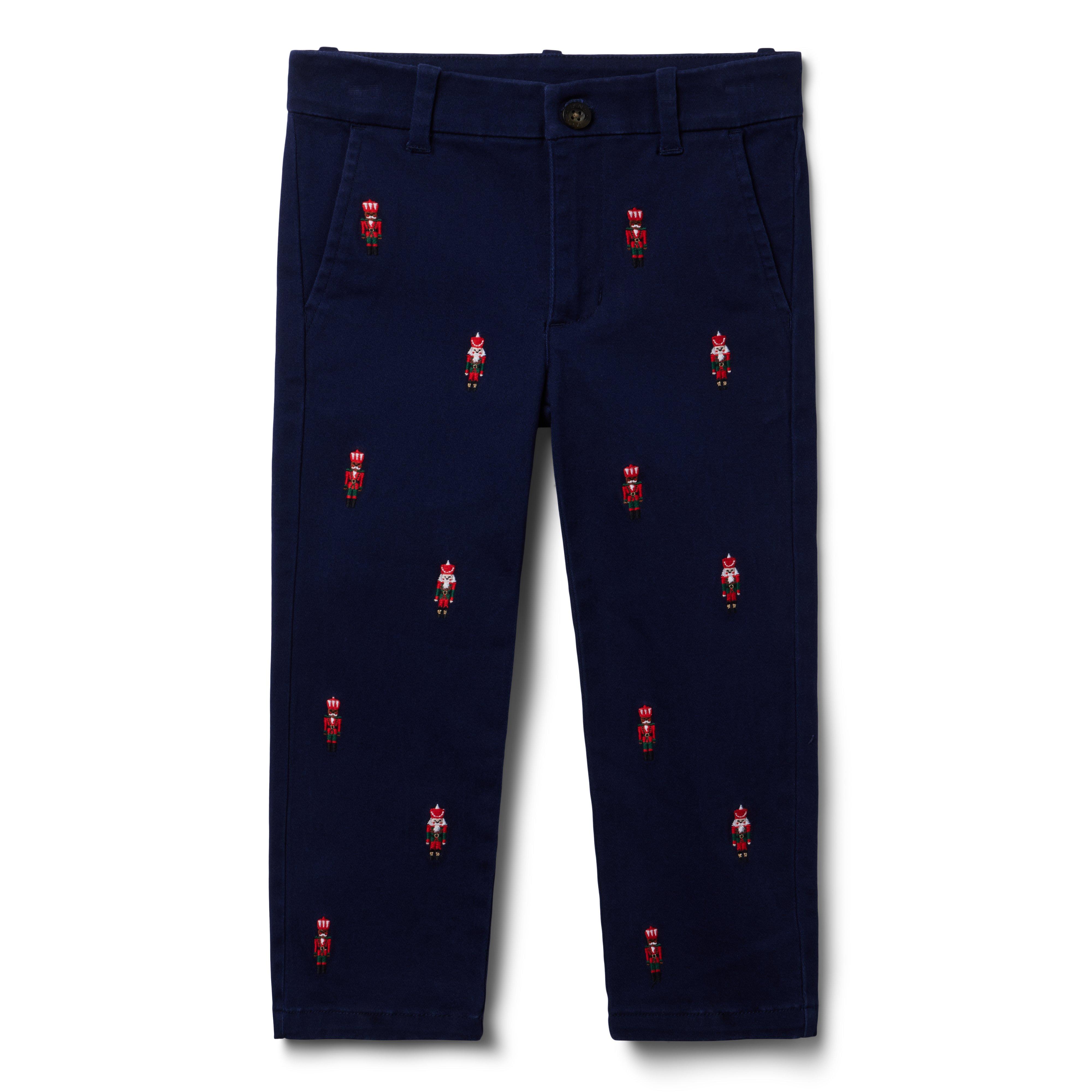 Our soft stretch pant with holiday charm thanks to allover embroidered nutcrackers. Features front and buttoned back pockets for the little things. 97% Cotton/3% Spandex Twill Fully Lined Zip Fly With Button Closure Front And Back Pockets Matching Family Styles Available Adjustable Waist (Sizes 18-24M - 8); Elasticized Back Waist (Sizes 6-12M - 12-18M) Machine Washable; Imported