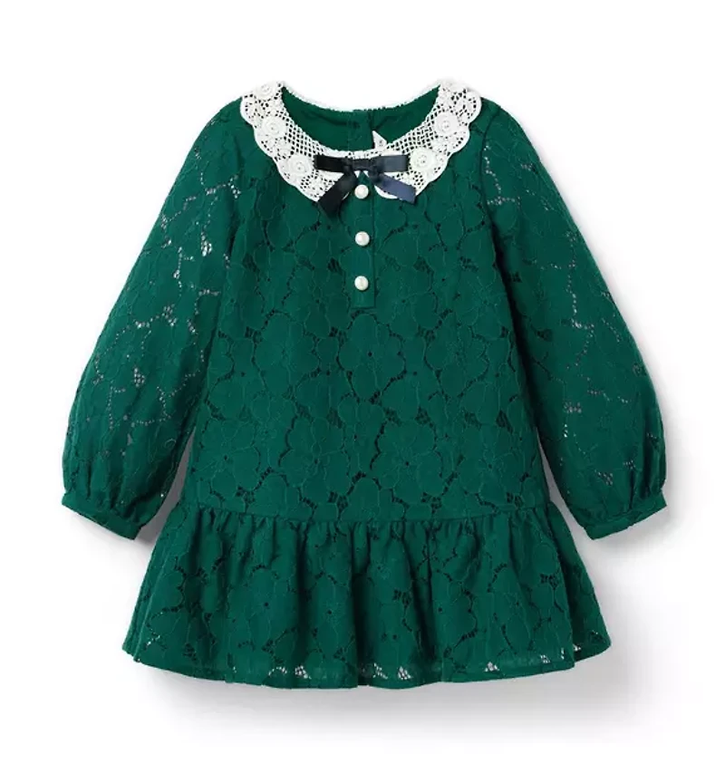 Crafted in floral lace, our dropwaist dress is ready for the holidays or any special occasion. A crochet lace collar, pearlized buttons and a bow detail make it unforgettable. 100% Cotton Lace; Lining: 100% Cotton Fully Lined Long Sleeve Button Back Bloomer Included (Sizes Up To 18-24M) Machine Wash, Gentle Cycle; Imported