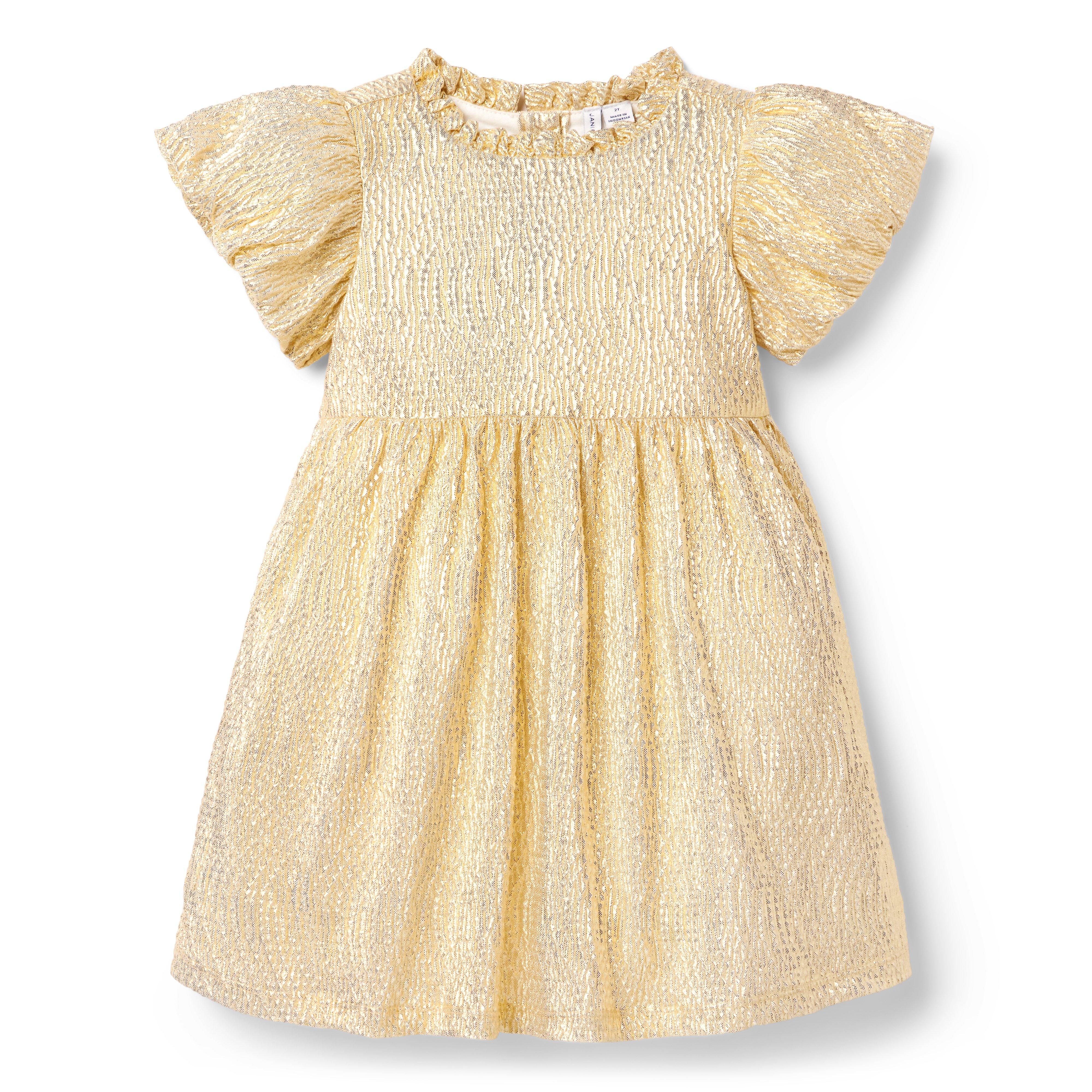 The details that make this holiday-ready dress shine? A ruffle collar, puff sleeves and an eye-catching metallic fabric. It's a true style standout. 100% Polyester; Lining: 100% Cotton Fully Lined Short Sleeve; Button Back Bloomer Included (Sizes Up To 18-24M) Now Including Tween Sizes Up To 16 Machine Washable; Imported