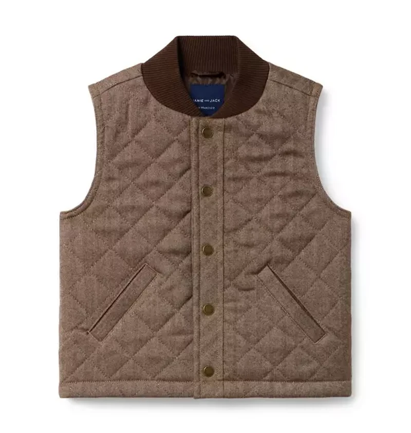 Their wardrobe's new vest friend. Inspired by classic menswear, our cozy herringbone vest is detailed with allover quilting and pockets too. 65% Polyester Herringbone/33% Rayon/2% Spandex; Lining: 100% Polyester; Filling: 100% Polyester Fully Lined Snap Front Front Pockets Machine Washable; Imported