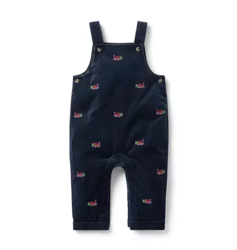 Next stop: first holiday moments. Our soft velvet overall features embroidered trains and a little back pocket too. Consider it your ticket to style. 100% Cotton Velvet; Lining: 100% Polyester Fully Lined Buttons At Sides; Adjustable Button Straps Full Leg Snaps; Back Pocket Makes The Perfect Gift For Baby Machine Washable; Imported