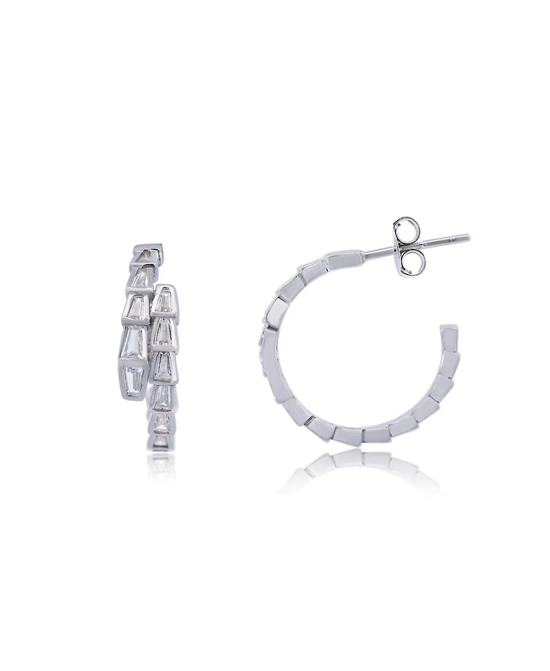 The Lovery Cz Snake Hoop Earrings are in Sterling Silver. Each piece measures approximately 18 x 5 millimeters - 0.75 x 0.19 inch, featuring tapered baguette cubic zirconia. Sold as a pair.