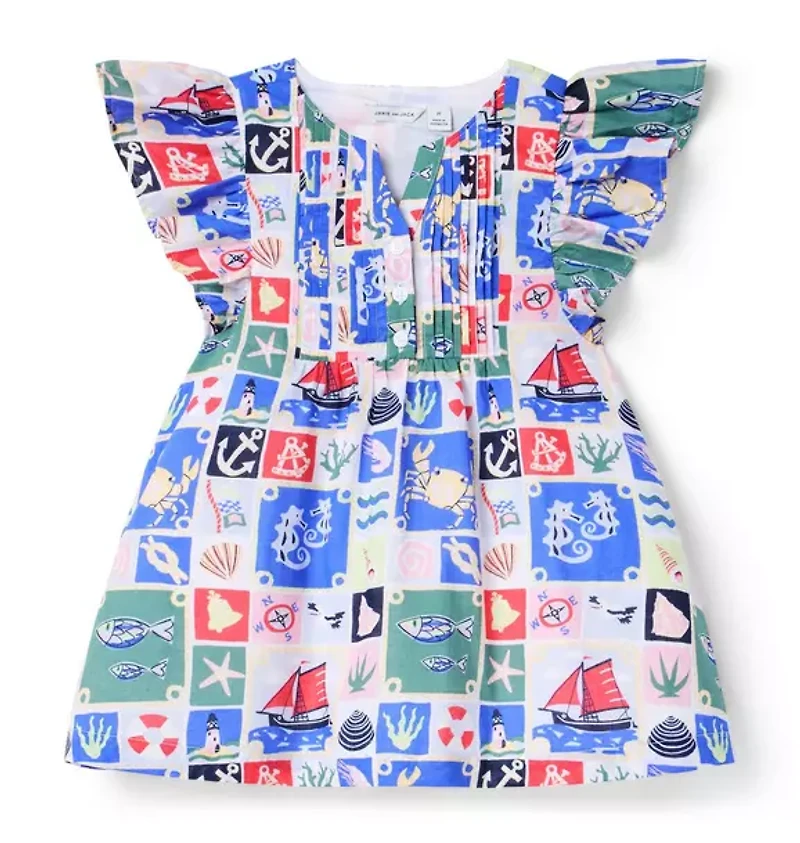 Set sail for sunny days with our dress featuring an allover nautical print. Designed in pure cotton with perfect pintuck details and flutter sleeves. 100% Cotton Batiste Fully Lined Short Sleeve; Half Button Placket Bloomer Included (Sizes Up To 18-24M) Matching Family Styles Available Machine Washable; Imported