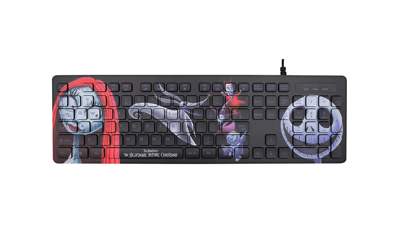 Transform your workspace into a whimsical and spooky world with this keyboard. Featuring iconic characters like Jack Skellington, Sally, this keyboard blends Tim Burton’s hauntingly charming aesthetic with functional design. The vivid keycaps are adorned with unique artwork from the beloved film, adding a touch of Halloween Town magic to your typing experience. With backlit keys for low-light conditions and a sturdy, responsive design, it's perfect for fans of the classic movie looking to elevate their desk setup. Whether you're typing by the glow of a pumpkin or the light of a Christmas tree, this keyboard will bring a bit of eerie joy to every keystroke.