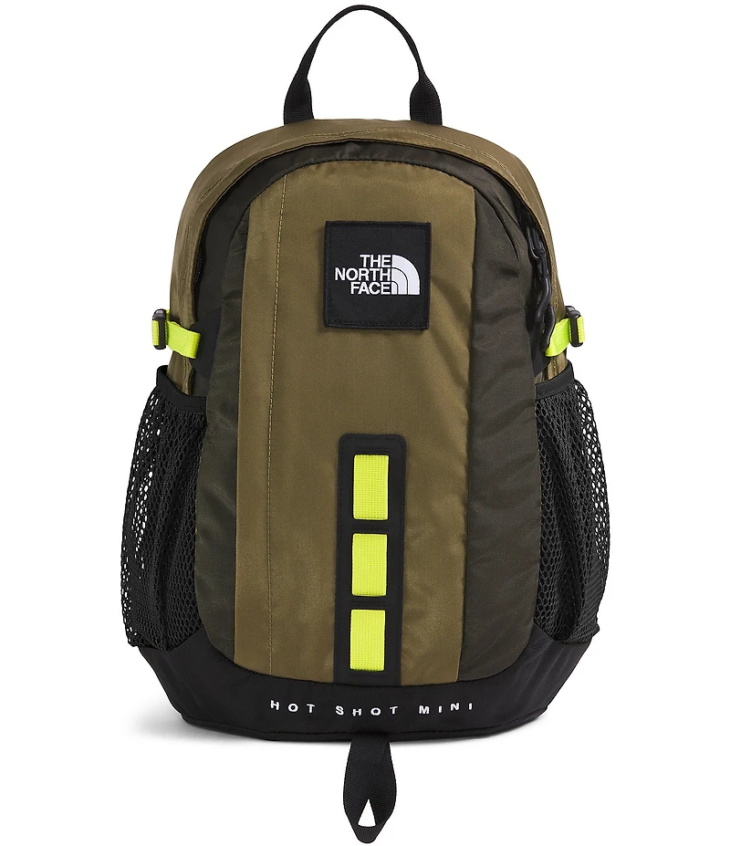 From The North Face, this Hot Shot Mini Backpack features:    Our classic Hot Shot daypack is reborn in a miniaturized version that s perfect for your smaller everyday journeys. With comfortable straps and a padded back panel for support, water-repellent fabric for unpredictable weather and daisy chain webbing for clipping extra gear, you'll be prepared from city to summit.  Injection-molded shoulder straps with PE foam for added comfort Comfortable, padded air-mesh back panel with a spine channel and PE sheet for extra back support Main compartment has a tablet sleeve. Vertical secure-zip pocket on front panel Two mesh water bottle pockets Top grab handle Side compression straps Daisy-chain webbing offers lash points Sizes: One size Body: 400D nylon with non-PFC durable water-repellent (non-PFC DWR) finish Boot: 840D recycled nylon with PU coating and non-PFC DWR finish Average Weight 1 lb. (440 g) Volume 12 liters Measures approx. 15" H x 11" L x 6" W (38 cm x 28 cm x15 cm)  Imported.