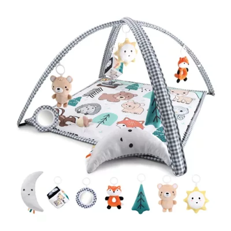 Our woodland play gym from the peanutshell is the perfect place for your baby to stretch out for stimulating tummy time! New sounds, shapes, and textures encourage learning and attract baby's attention. The easy-to-assemble baby activity play gym is accented with high contrast montessori inspired artwork featuring your favorite woodland animals including a fox, bear, deer, owl, hedgehog and more. Six removable plush hanging toys are included to help promote sensory development and cause/effect learning. The interactive activity mat features: Mirror, rattle, crinkle, bell, fidget ribbons and open/close flaps to help strengthen fine motor skills and improve cognitive development. The playgym transitions across multiple developmental stages from lay and play, to tummy time, to sitting up. Rest assured that baby will be safe thanks to a sturdy design, durable construction, and non-skid backing. Play gym mat and pillow are machine washable. When playtime is over, simply wipe toys with a damp cloth for effortless cleanup.
