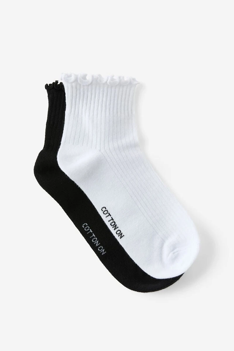 An easy essential, just elevated. The Perfect Pair Frill Rib Ankle 2Pk features a ribbed construction with a pretty frilled edge at the ankle. Made with cotton for a soft, breathable feel, this two-pack includes one white and one black pair. Wear with sneakers or ballet flats for an effortlessly polished look.