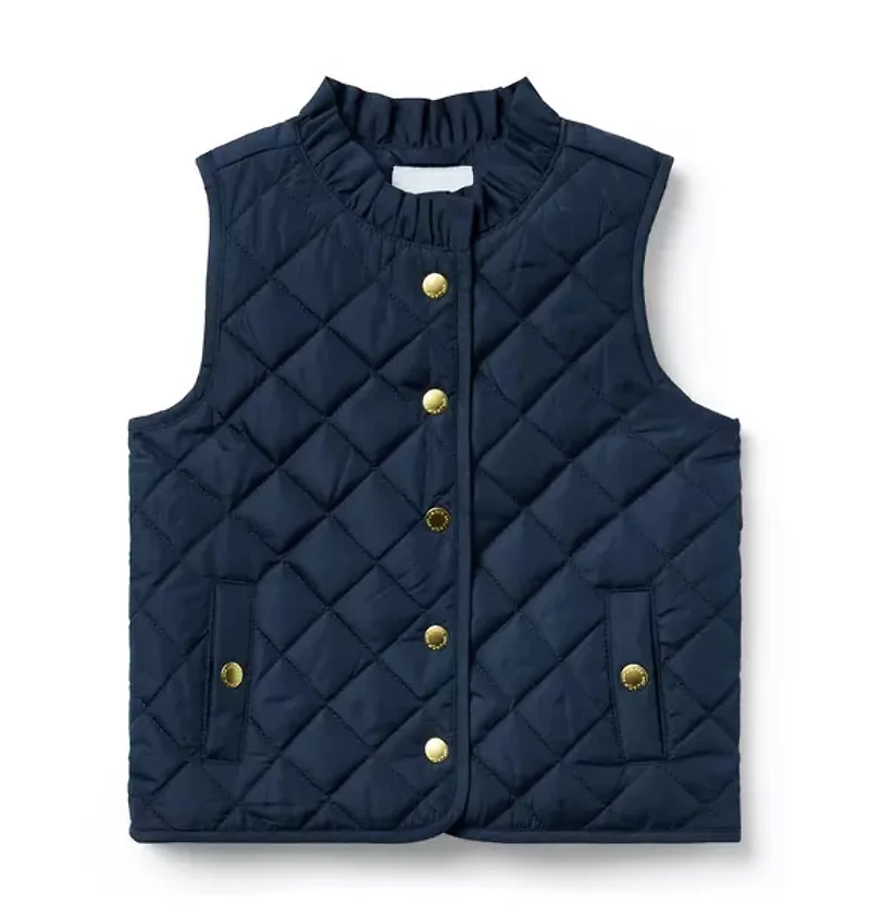 The vest with the best details—from the ruffle collar to the gold-tone buttons and the allover quilting too. It’s a style staple to reach for again and again. 100% Polyester; Lining: 100% Polyester; Filling: 100% Polyester Fully Lined Snap Front Front Pockets Machine Washable; Imported