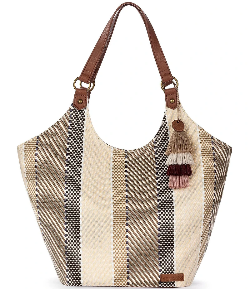From The Sak, this handbag features: Straw exterior Repreve lining Magnetic snap closure Antique silver tone hardware Back zipper pocket Interior contains a back wall zipper pocket and two front wall multi-functional pockets Adjustable closure at sides that expands the bag Double shoulder straps approx. 11" drop Approx. 17.5" L x 7" W x 10.5" H Imported.