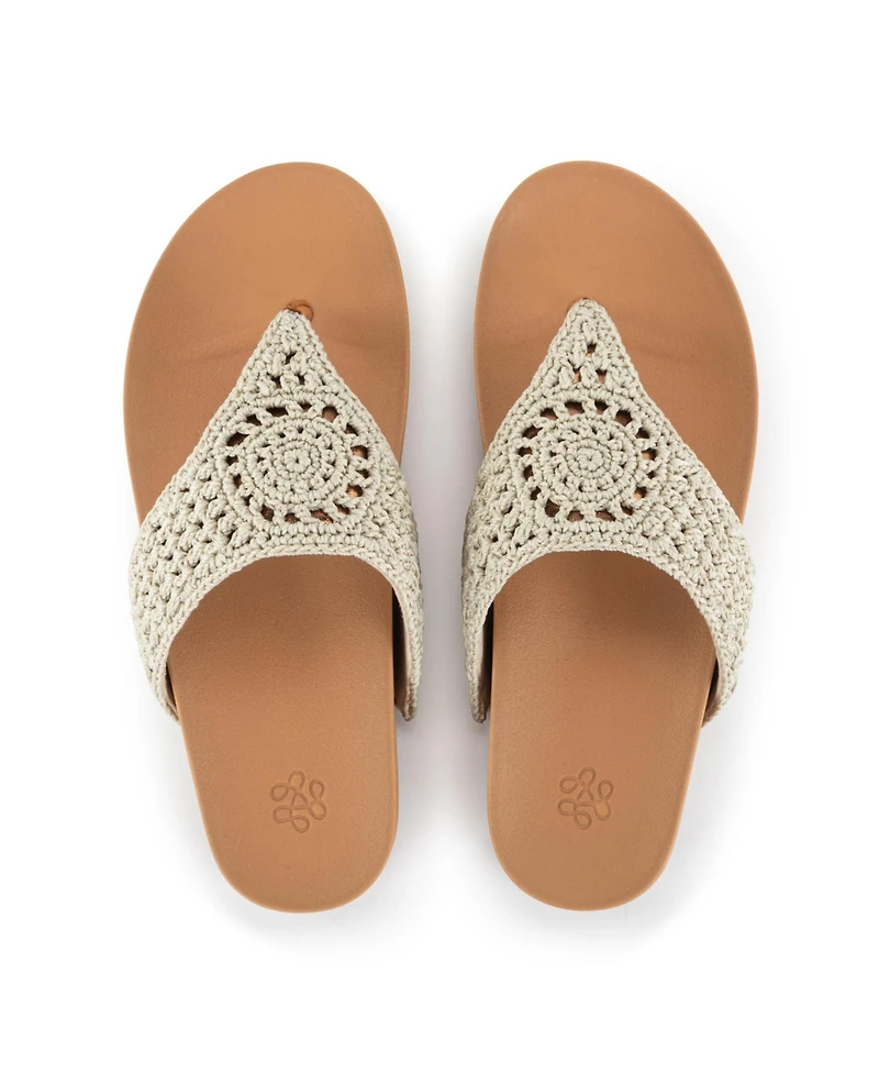 Set atop a padded footbed, the high-contrast, hand-crocheted upper is made from ocean-bound plastics. A monogrammed rubber outsole grounds this pedi-ready style, which pairs effortlessly with dresses, denim, swimwear and more.