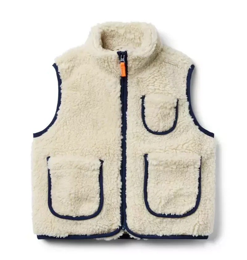 Layer up in style with our adventure-ready vest. Designed in soft sherpa with contrast trim and pockets for all their little treasures, it's an instant wardrobe favorite. 72% Polyester Sherpa/28% Acrylic; Lining: 100% Cotton Fully Lined Zip Front Front Pockets; Chest Pocket Machine Washable; Imported