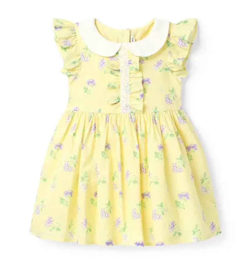 Sunny days bring fresh flowers with our dress in pure cotton. With flutter sleeves, lace trim and a contrast collar, it's just the thing for spring. 100% Cotton Batiste; Lining: 100% Cotton Fully Lined Short Sleeve Button Back; Bloomer Included (Sizes Up To 18-24M) Matching Family Styles Available Machine Washable; Imported