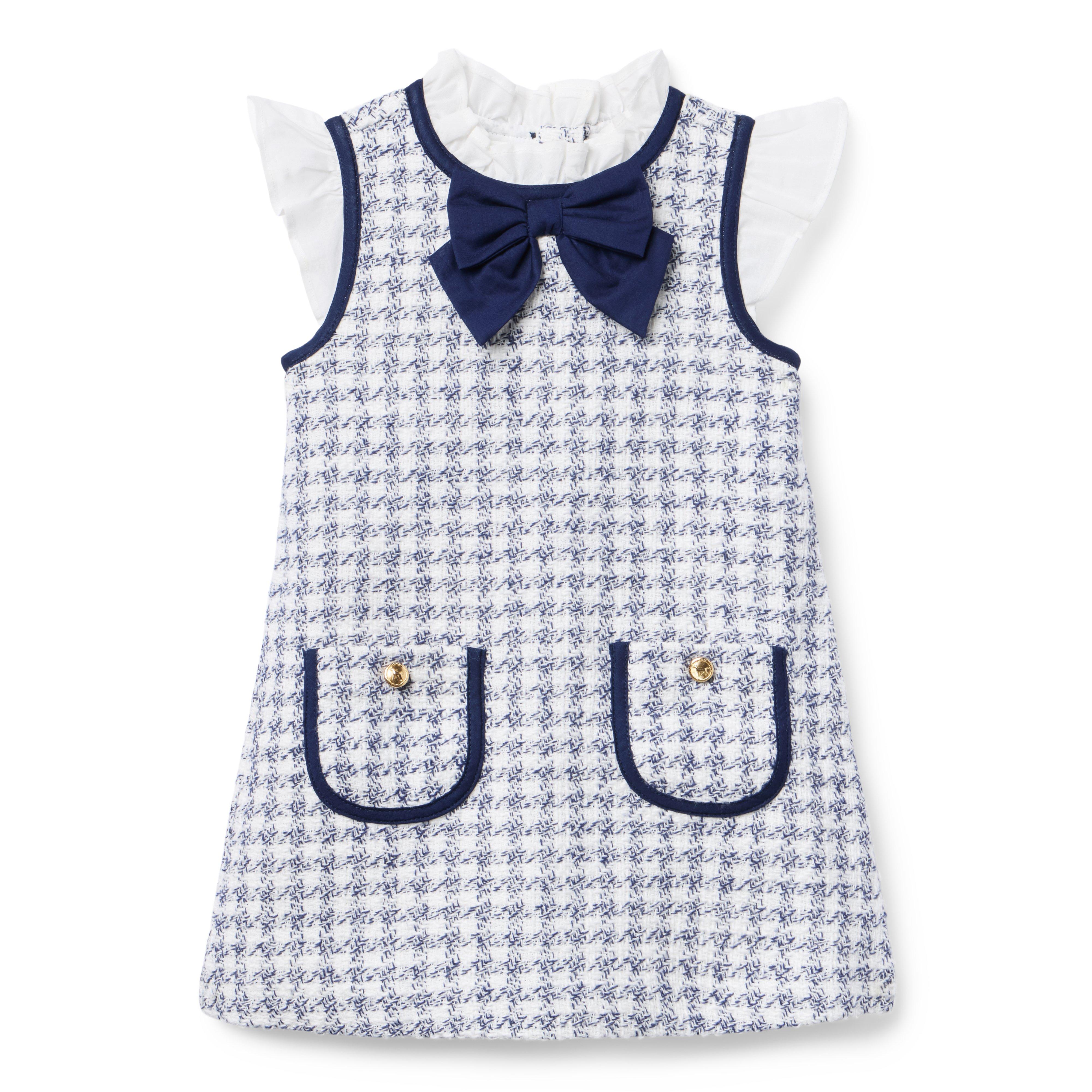 Follow the thread to a fashionable season. Our houndstooth tweed dress is tailored and timeless, designed with ruffle details, a contrast bow and patch pockets too. 100% Cotton Tweed; Lining: 100% Cotton Fully Lined Short Sleeve Button Back Front Pockets; Bloomer Included (Sizes Up To 18-24M) Machine Wash, Gentle Cycle; Imported