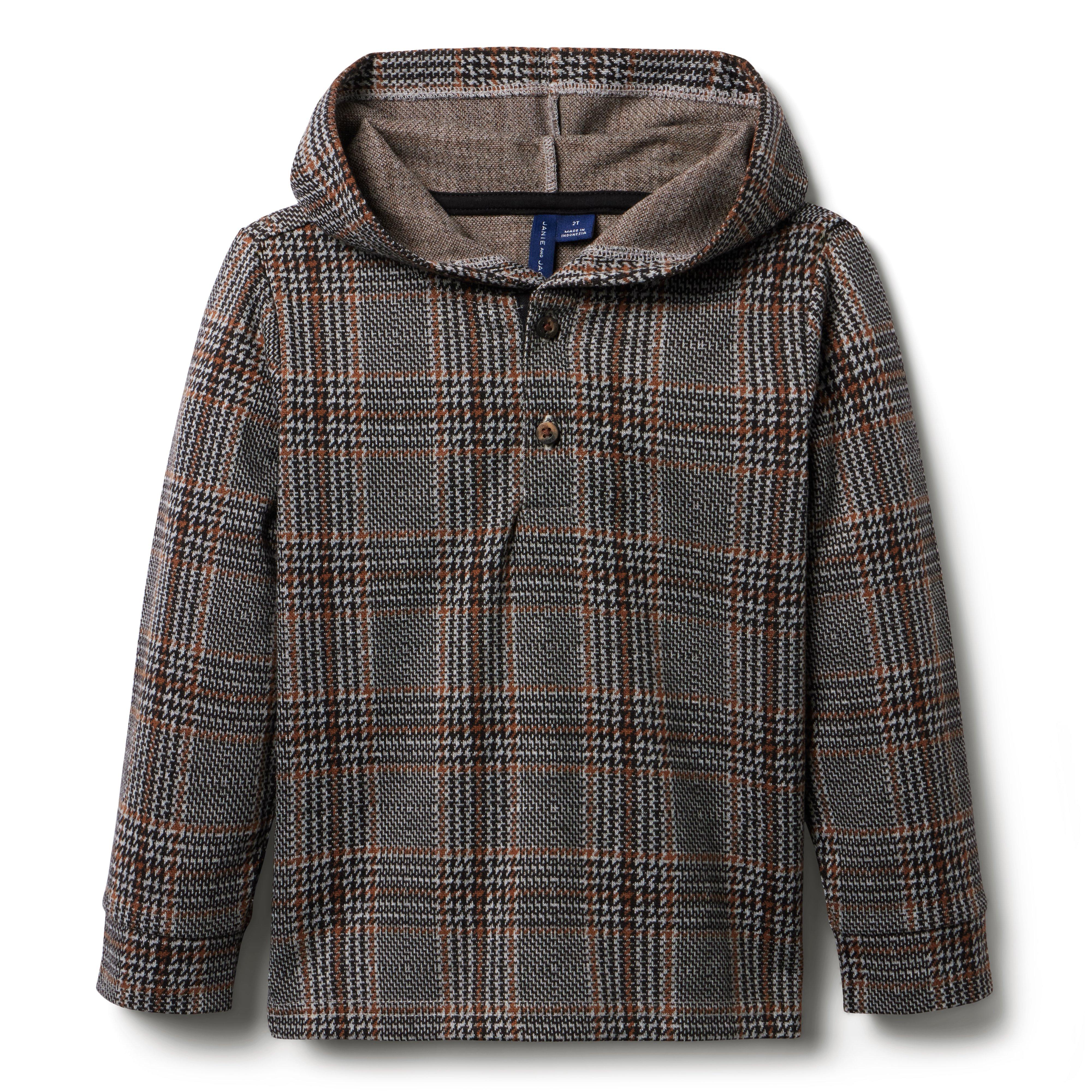 The layer we love for any occasion, this tartan pullover in double-knit jacquard with a hood for cozy style. 67% Polyester/32% Rayon/1% Spandex Jacquard Long Sleeve Half Button Placket Hem Vents Machine Washable; Imported