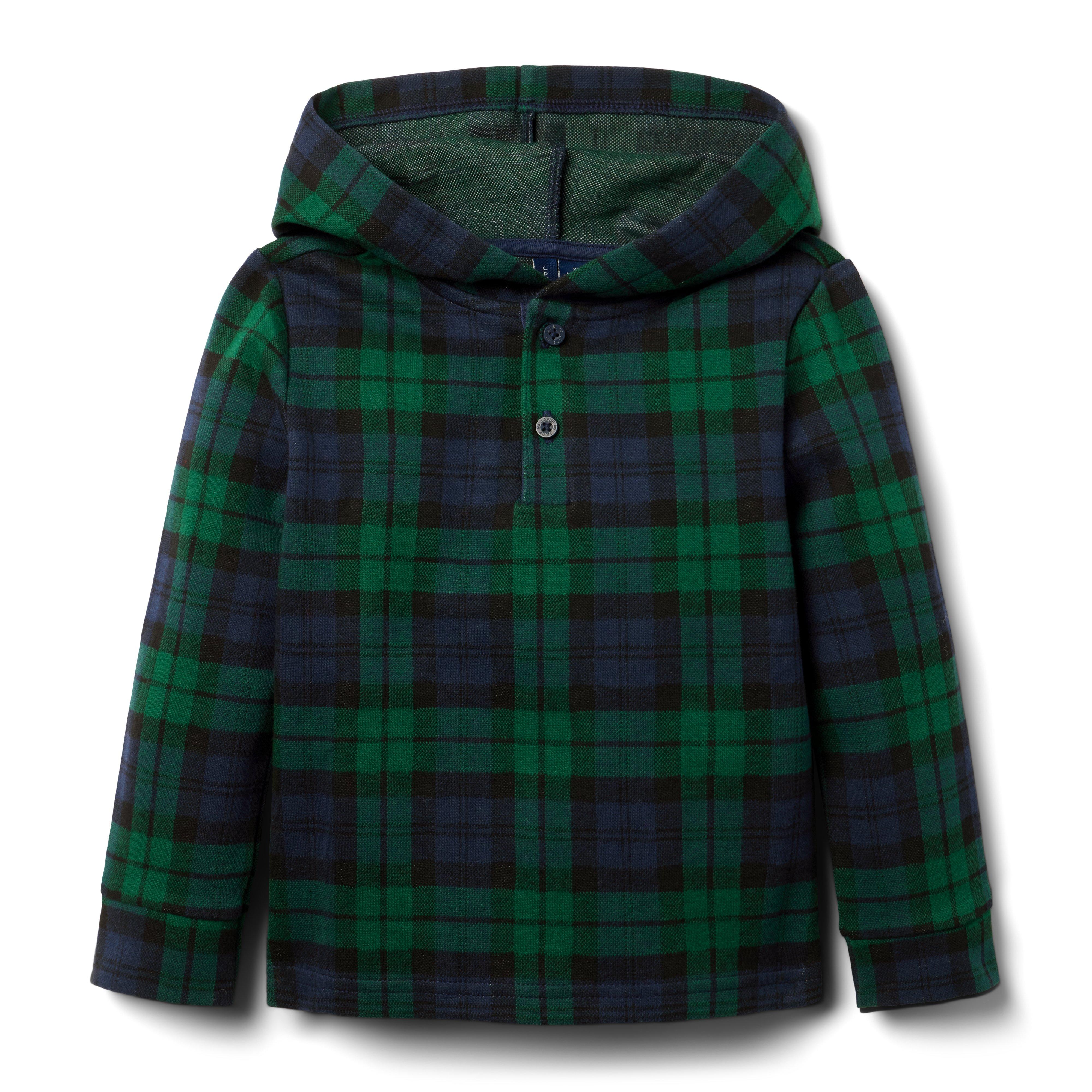 The layer we love for any occasion, this tartan pullover in double-knit jacquard with a hood for cozy style. Pairs well with our matching pieces, and just about everything else too. 94% Cotton/6% Nylon Jacquard Long Sleeve Half Button Placket Hem Vents Matching Family Styles Available Machine Washable; Imported