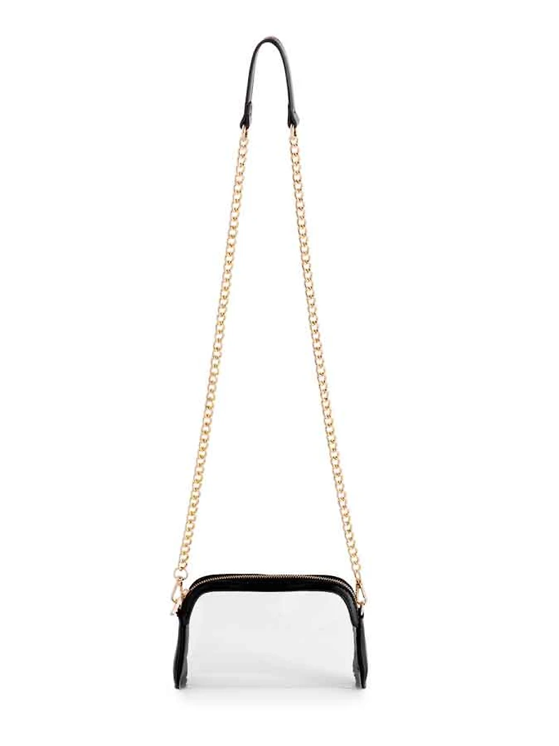 Meet the Taylor Cross-body – your go-to bag for stadium games, concerts, or any event where style and security go hand-in-hand. Made from sleek, transparent PU, this compact cutie is perfect for storing your essentials while staying event-compliant. It features a chic gold chain strap with a vegan leather shoulder detail that’s both comfy and detachable. Swap out the strap to mix and match with your favorite accessories for a personalized twist.. Made from TPU and smooth PU with gold hardware
