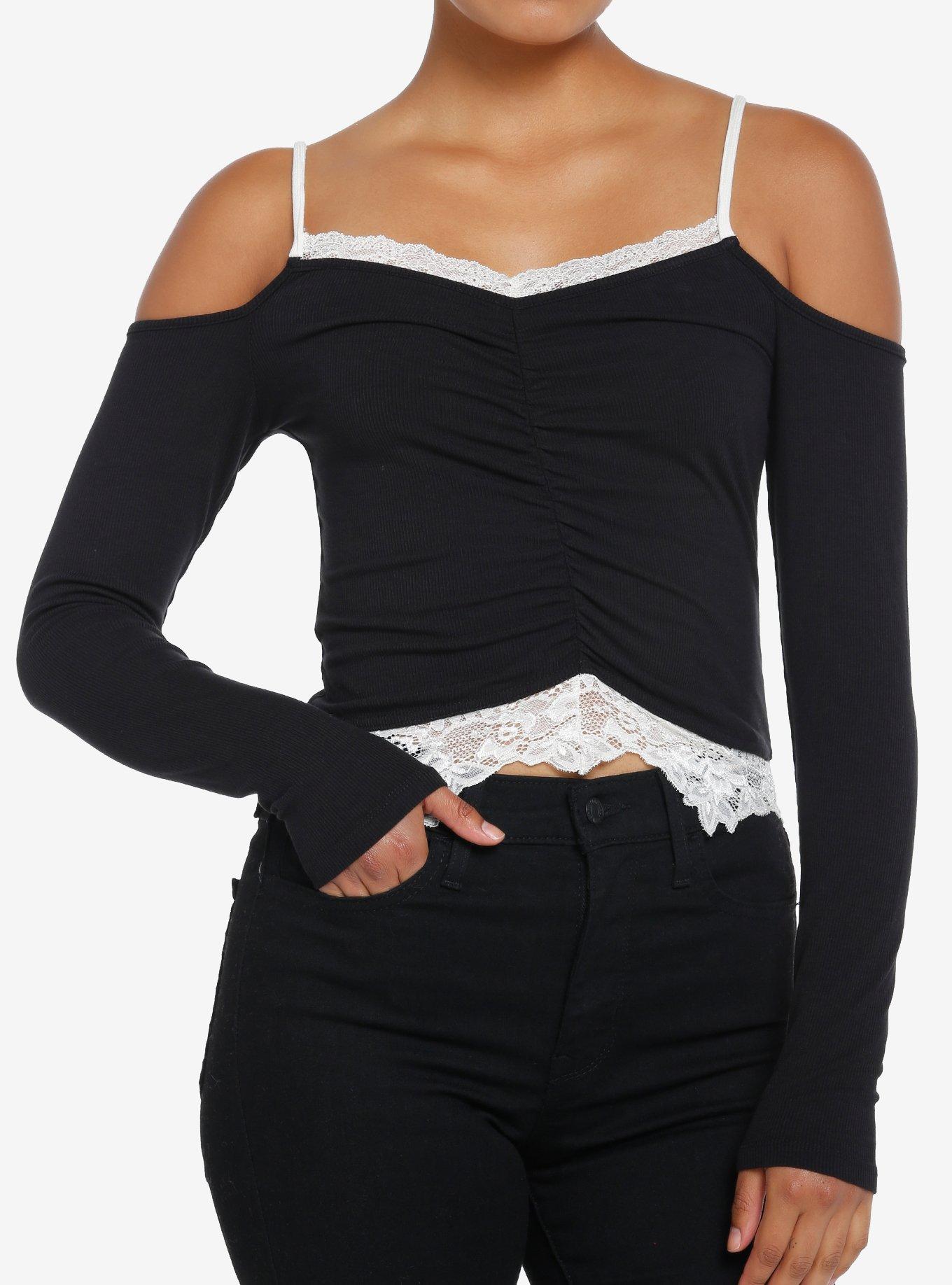 Thorn & Fable Black Ruched Lace Trim Girls Cold-Shoulder Top in Franklin, TN