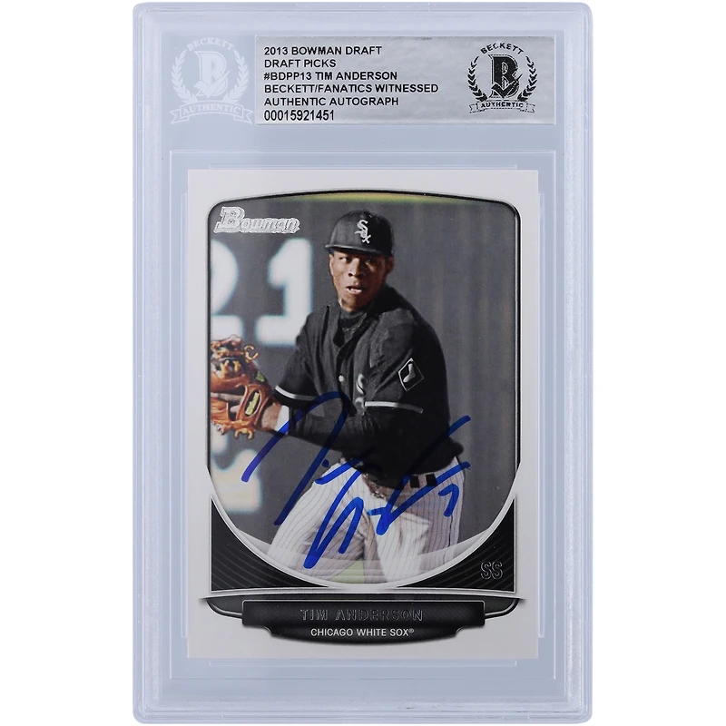 This Tim Anderson autographed 2013 Bowman Draft #BDPP13 Beckett Fanatics Witnessed Authenticated Rookie Card is ready to help you display your Chicago White Sox fandom. Featuring a Beckett-certified slab, this collectible also showcases the unique signature of Tim Anderson to make it the ultimate collector's item.