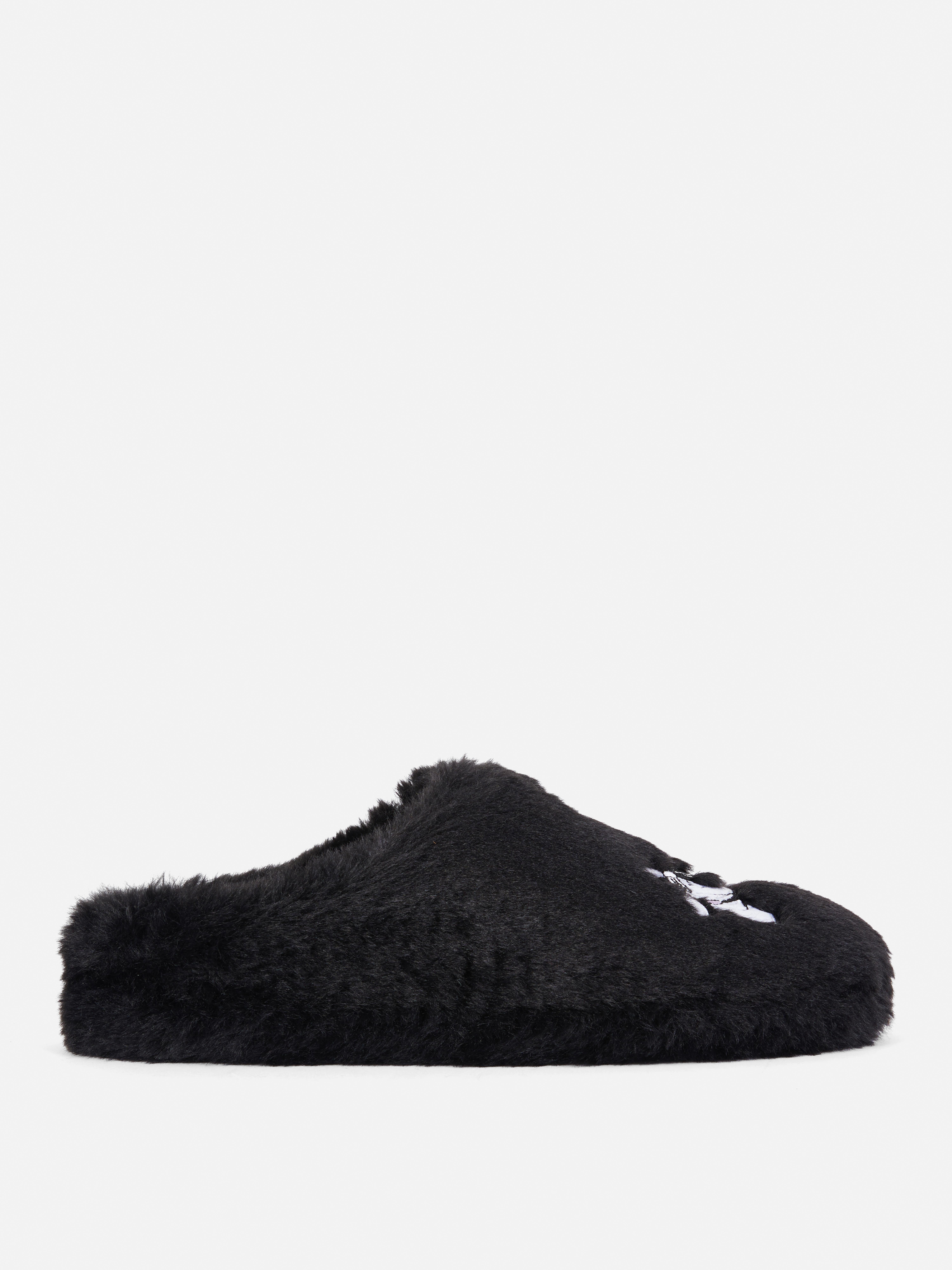 Black fluffy mule slippers with Jack Skellington print and cozy lining