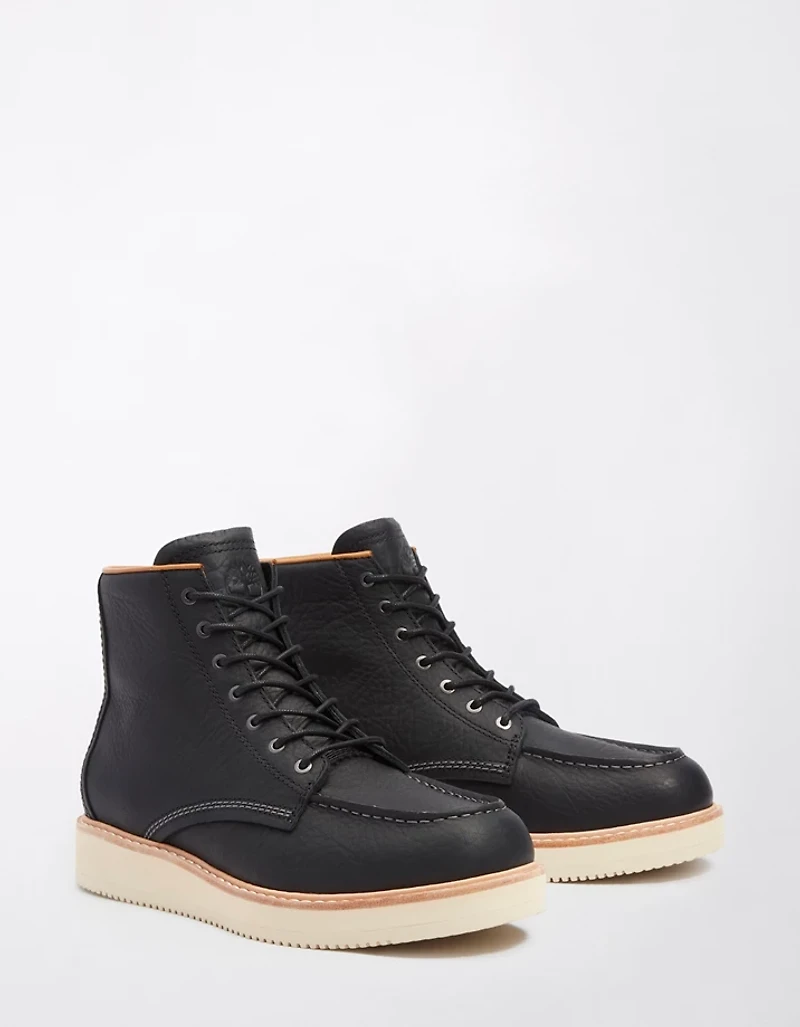 Crafted from exclusive Timberland® Premium Highway waterproof leather, the Oak Forge men’s boot strikes a balance between commanding presence and refined style. A double row of stitching, moc-toe design, and collarless, streamlined silhouette create a sleek contrast against athletic off-white outsoles.