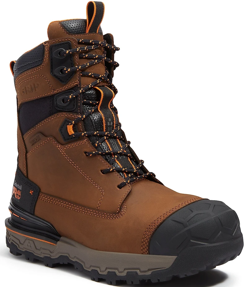 From Timberland PRO®, the Men's Boondock Ultralight 8" Composite Toe Waterproof Work Boots feature: Full-grain, Premium Timberland® Waterproof Leather upper with abrasion-resistant Ever-Guard™ leather and molded TPU reinforcements, plus an internal waterproof membrane Timberland supports responsible manufacturing of leather via the Leather Working Group Asymmetrical composite safety toe Electric hazard protection Non-metallic shank for structural support Metal-free upper with eyelet reinforcements and molded TPU dual purpose hooks for lacing customization Breathable, moisture-wicking lining with antimicrobial treatment for odor control Ventilated Anti-Fatigue Technology polyurethane footbed for climate control, shock absorption, and energy return Lightweight HoverSpring™ foam midsole helps provide underfoot comfort, flexibility, and durability Combination Goodyear welt and cement forefoot construction for durability and flexibility Lightweight and non-marking, All-Weather TPU outsole is heat-, oil-, slip-, and abrasion-resistant Imported.