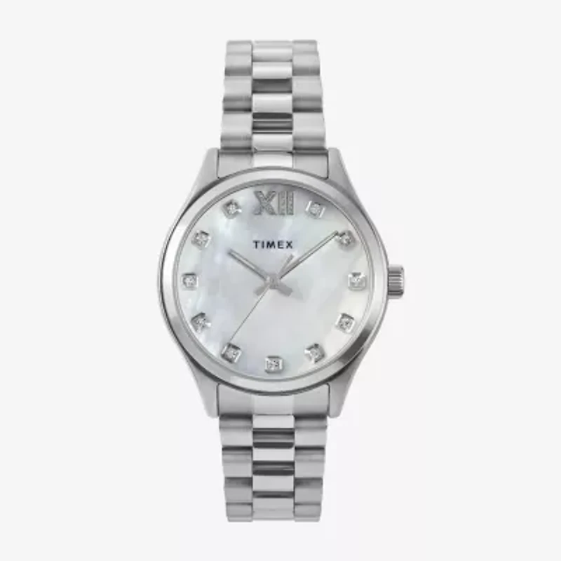 A fresh take on a traditional watch, the Timex legacy never fails to find new ways of telling our story. This thoughtfully crafted timepiece features a silver-tone 34mm case and coordinating stainless-steel bracelet with a natural mother-of-pearl dial that shimmers with your every movement. A testament to our heritage and well-suited for everyday wear, the dial offers gorgeous crystal accents, luminant hands, and a glittering roman numeral marker at 12 o’clock.