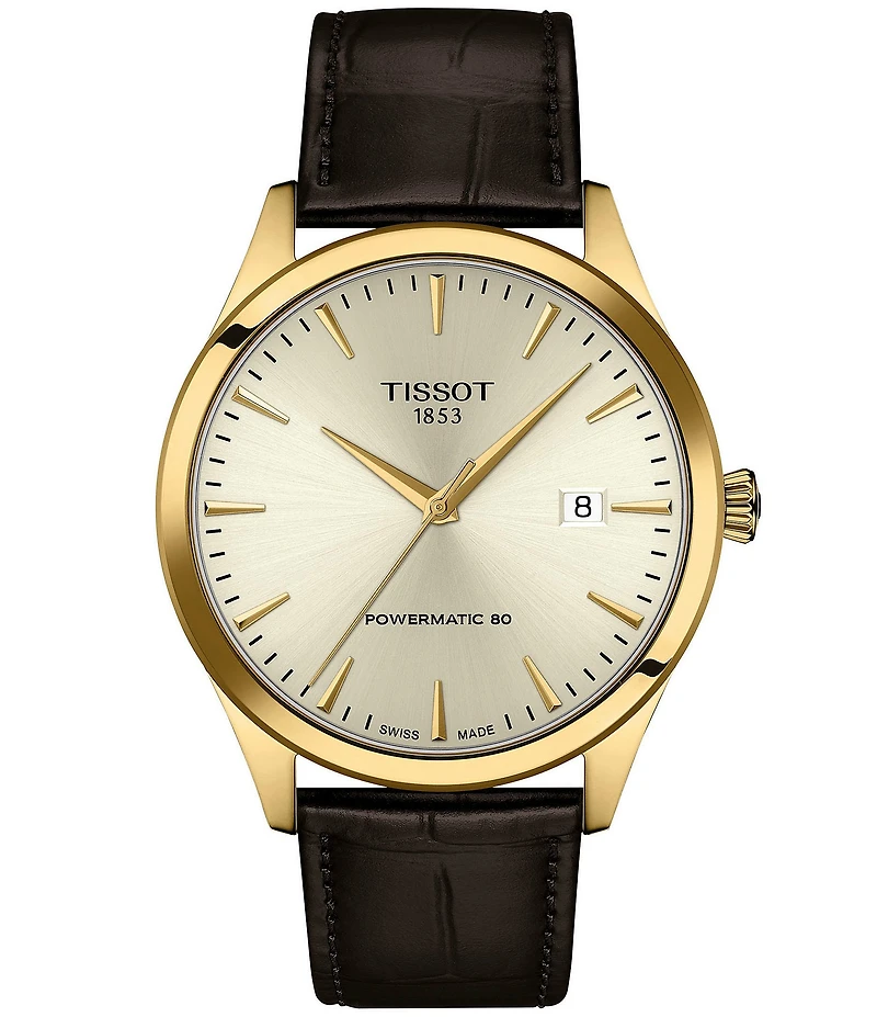 From Tissot, this men's watch features: Leather strap 316L stainless steel case  Scratch-resistant sapphire crystal  Automatic movement Case size approx. 40mm Interchangeable quick-release bracelet Buckle closure Water-resistant up to a pressure of 5 bar (50 M / 165 Ft) Swiss-made Imported.