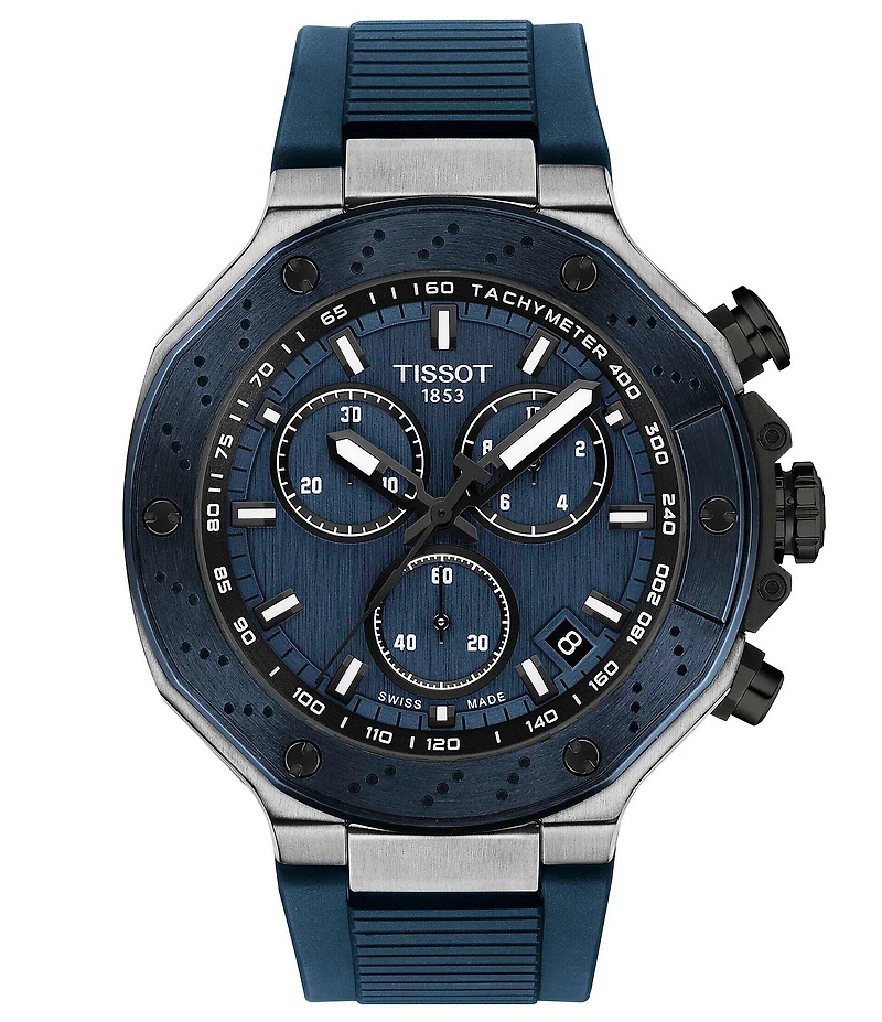 From Tissot, this watch features: Round case shape 316L stainless steel case Approx. 45mm case size Scratch-resistant sapphire crystal with antireflective coating dial Quartz Chronograph movement Silicone strap closure Water-resistant up to a pressure of 10 Bar (100 M / 330 Ft) Imported.