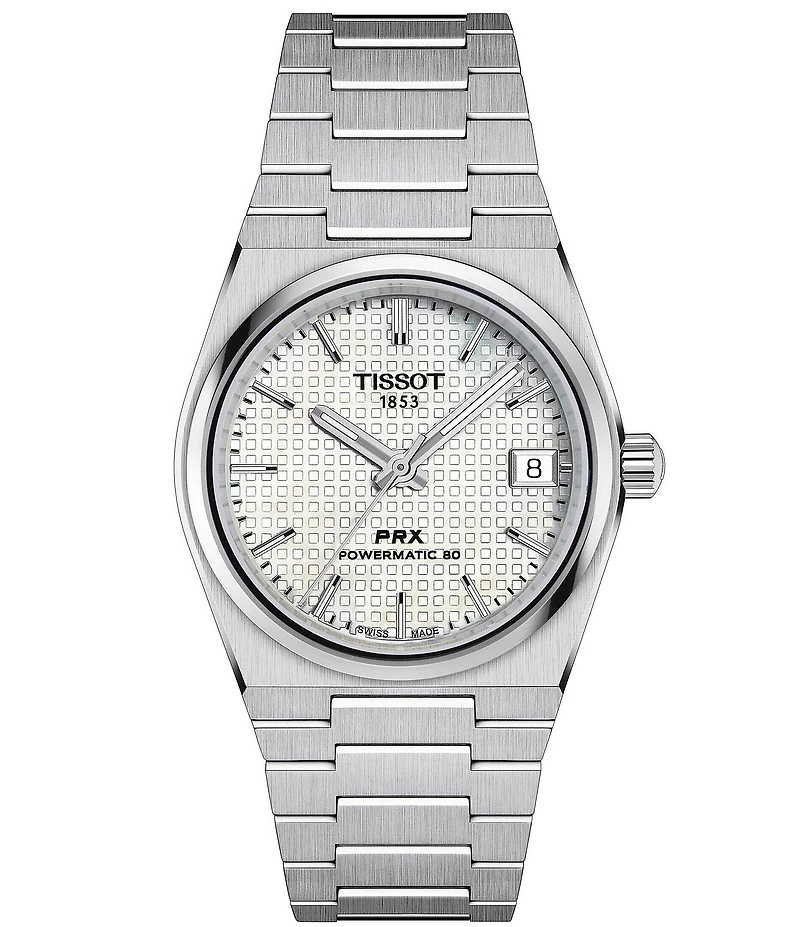 From Tissot, the Women's Prx Powermatic 80 Automatic Stainless Steel Bracelet Watch features: Stainless steel bracelet 316L stainless steel case Scratch-resistant sapphire crystal White Mother of pearl dial Butterfly clasp with push-buttons Automatic movement Case size approx. 35mm Water-resistant up to a pressure of 10 bar (100M / 330ft) Imported.