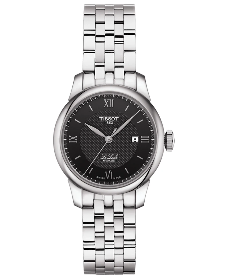 Tissot's compact stainless steel Le Locle watch is very elegant with a polished brick-link bracelet and beautifully marked black dial. Style #T0062071105800