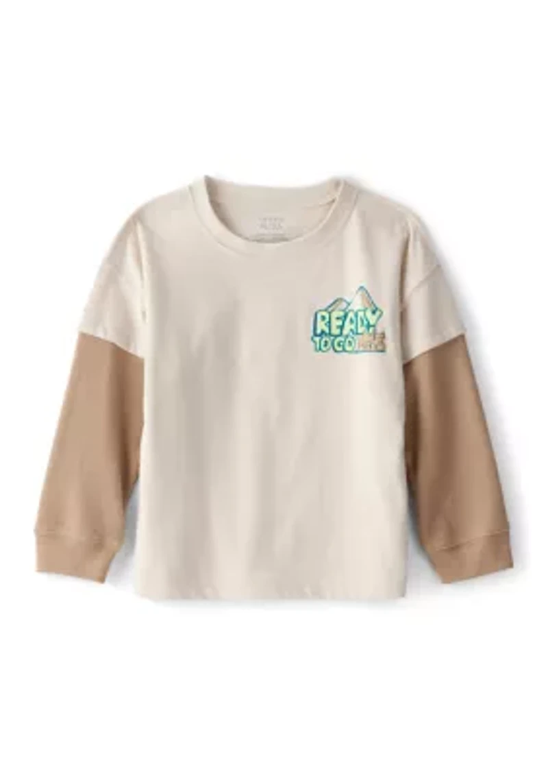 This graphic t-shirt brings a little adventure to the everyday. With its bold “Ready to Go” graphic and skater-inspired colorblock sleeves, it’s built for whatever your toddler’s day throws at it — whether heading to the park or cruising through snack time. The relaxed fit and dropped shoulders keep things casual, comfy and easy to layer when temps dip. Made with soft 100% cotton for everyday comfort, while the long sleeves feature textured polyester panels for mixed media appeal. Pullover Crew neck Long sleeves Screenprinted front and back Imported Material & Care Cotton, polyester Machine washable