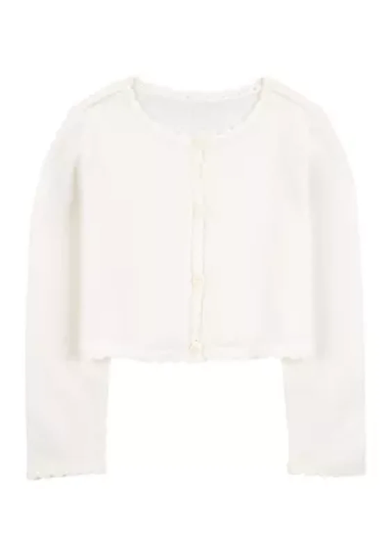 Crafted in soft sweater cotton and designed with a sweet wave trim, this button-front cardigan from Carter's® makes the perfect layer. Button closure Boat neck Imported Material & Care 100% cotton Machine washable