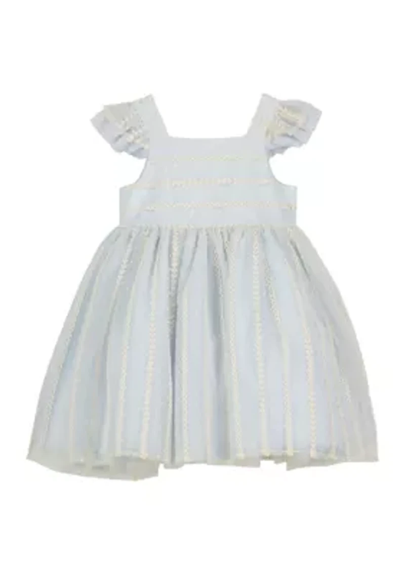 Intricate embroidery decorates this dotted Swiss dress from PASTOURELLE. Fit-and-flare in design, this special-occasion look features a lovely empire style with a square neckline fitted to the wonderfully full skirt. Empire design Striped with decorative cotton embroidery Fit-and-flare silhouette Fully lined Button closure Square neck Short flutter sleeves Imported Product Specifications Knee length Material & Care Cotton, polyester, nylon Machine washable