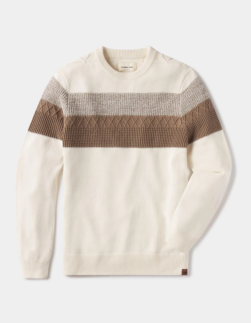The Tom Stripe Crew is a true-to-size cotton sweater with a soft, classic handfeel and tonal texture that sets it apart. Knit with a jersey stitch base and accented with rib and cable details, it layers in depth with mixed stitch techniques and heathered, twisted yarns for natural color variation and dimension. A timeless staple.
