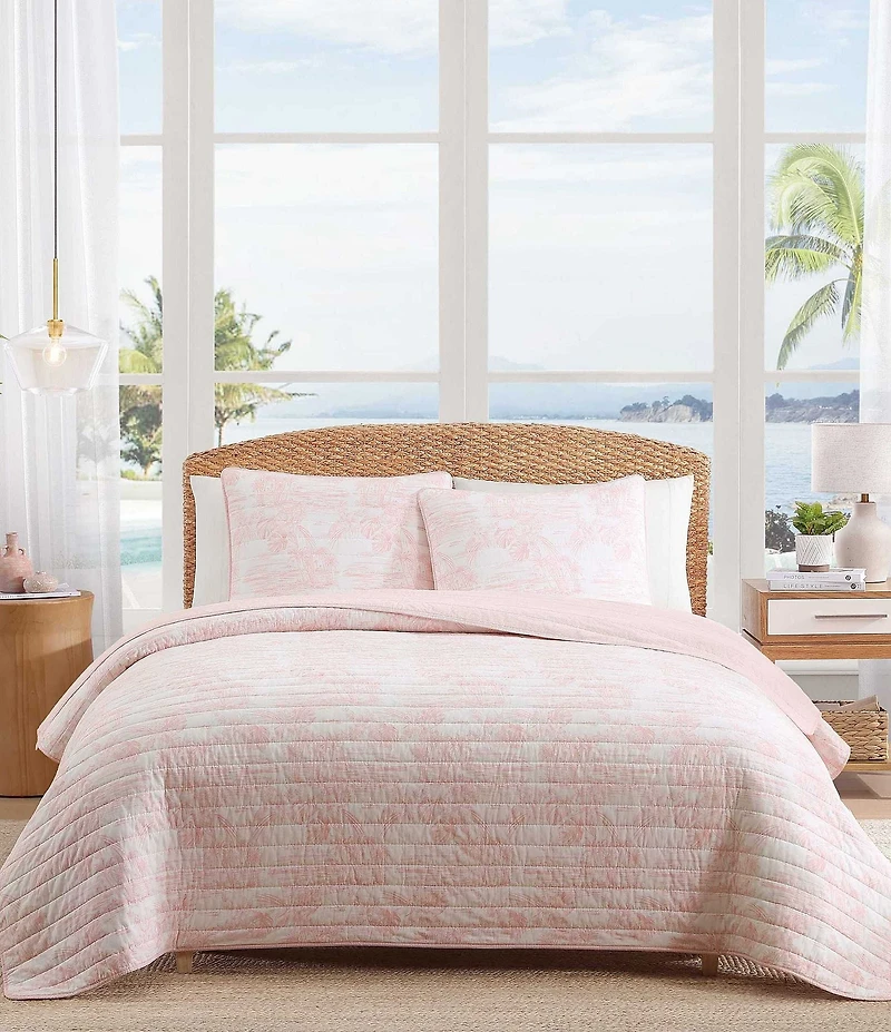 From Tommy Bahama, this quilt mini set features: Bring the beauty of a coastal retreat into your bedroom with the Tommy Bahama beach bluff toile quilt mini set. Inspired by breezy shorelines and tropical botanicals, this quilt set blends timeless elegance with everyday comfort. The light pink toile print on a white ground adds a soft, serene touch, while palm trees and Island florals evoke the tranquility of an endless getaway. Crafted from 100% cotton Set includes one quilt, two shams Lightweight and perfect for layering Fully reversible Ideal for year-round use Pre-washed for added softness Machine washable, for easy care. Tumble dry low Each set sold separately Full/Queen quilt mini set includes: Quilt approx. 90" L x 90" W Two standard shams approx. 21" L x 27" W each King quilt mini set includes: Quilt approx. 96" L x 104" W Two king shams approx. 21" L x 37" W each Imported.