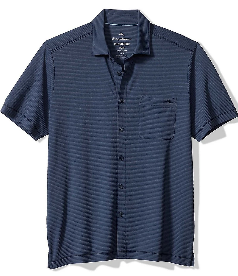 From Tommy Bahama Big & Tall, this shirt features: Textured stripe pattern Spread collar Short sleeves Button-front closure Left side pocket with "Marlin" embroidery Quick dry Moisture wicking Stretch fabric Recycled nylon/recycled polyester/spandex Machine wash/tumble dry Imported.