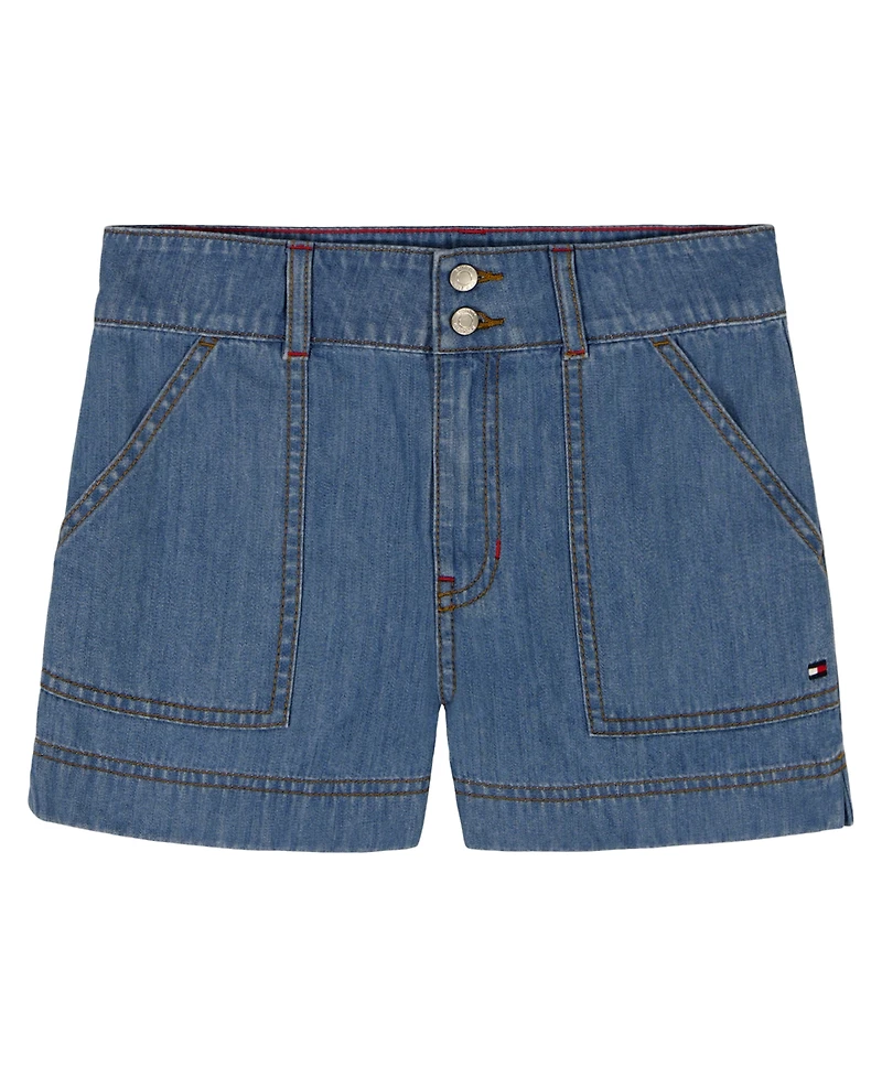 Embrace a retro vibe with these Tommy Hilfiger denim shorts, designed with a wide double-button waistband and zip fly closure. Patch pockets at the front and back, along with front seam slits, add functional style for warmer days.