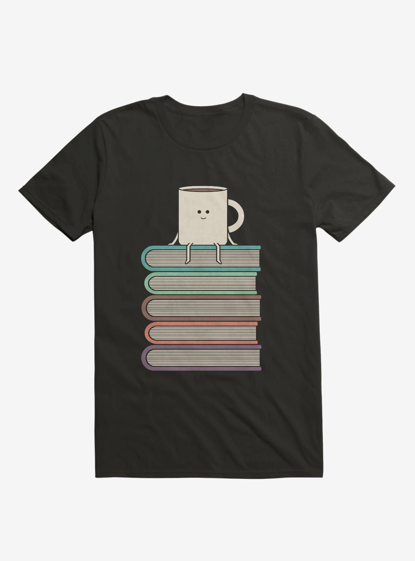 Books and coffee -- that's all you need. Well, maybe oxygen too... and some other stuff... let's not get too technical here, okay? This lightweight black graphic tee features a happy cup atop a stack of books. Officially licensed art from handsoffmydinosaur.